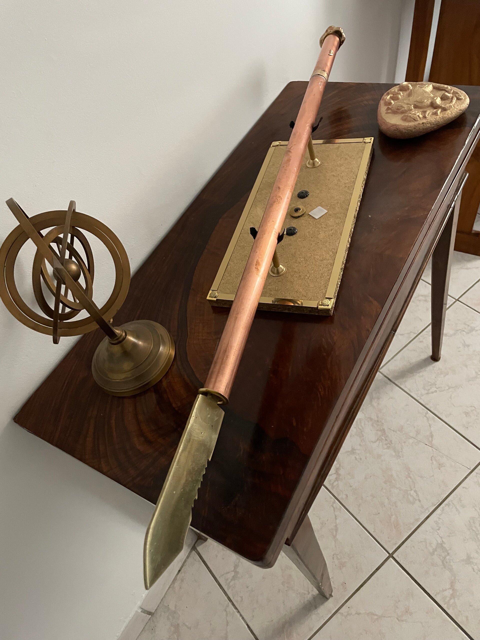 Pendule de djed ( le pilier cosmique) de l'Égypte antique il fait référence à la célèbre phrase : tous ceux qui est en haut est en bas et tous ce qui est en bas est en haut . Doté d'un compartiment pour du sablé magnétisé ou autre . Fabriqué cuivre et laiton entièrement.